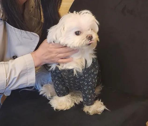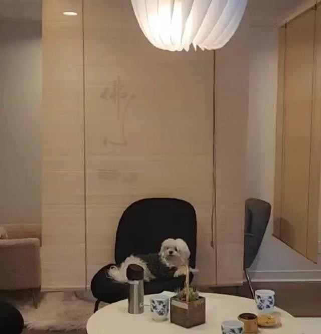 王祖贤和她的爱犬都在店里,王祖贤给她的狗狗穿了蓝色小花袄,它被照顾得很好。王祖贤在店里忙,狗狗安静的趴在椅子上,它很可爱。